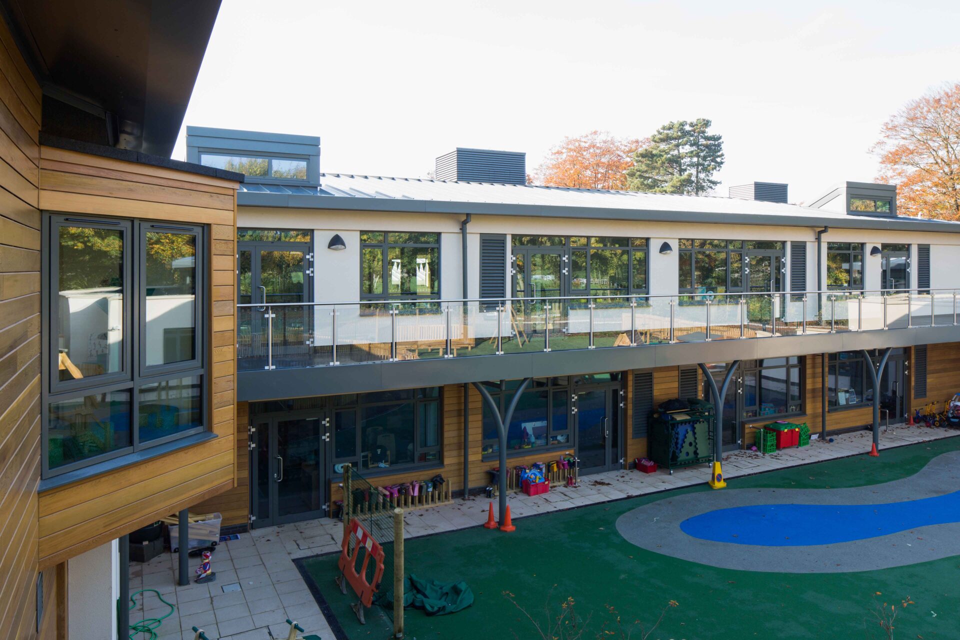 The new Pre-Prep at Monkton Combe School, Bath, sits on a challenging site with significant structural, planning and ecological issues. Part of the site lies within the Green Belt and is home to an established community of badgers and a nationally important colony of bats, protected under European law. The design includes a nursery, new classrooms, home economics room, function room and a multi-activity hall. A key feature of the building is the central courtyard garden which allows free flowing access for all EYFS pupils into a safe protected and fun external classroom.